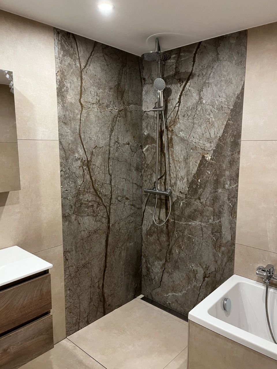 3. Für Wand und Boden kamen großformatige Fliesen in einem warmen, beigen Ton zum Einsatz. Im Duschbereich setzt eine markante Akzentfliese in Naturstein-/Marmoroptik einen besonderen Blickfang. Das ruhige Grundmaterial und die lebendige Dusch-Rückwand spielen bewusst zusammen. Anschließend wurden die neue Wanne mit verfliester Verkleidung, die ebenerdige Dusche mit Rinne, das wandhängende WC sowie der schwebende Waschtisch mit Holzoptik-Fronten und Spiegelschrank montiert. Zum Abschluss folgten die Malerarbeiten an den nicht gefliesten Flächen und die letzten Silikon- und Detailfugen.